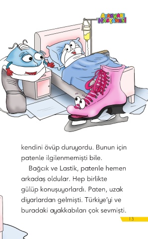 kendini övüp duruyordu. Bunun için patenle ilgilenmemişti bile. Bağcık ve Lastik, patenle hemen arkadaş oldular. Hep birlikte gülüp konuşuyorlardı. Paten, uzak diyarlardan gelmişti. Türkiye’yi ve buradaki ayakkabıları çok sevmişti. 13