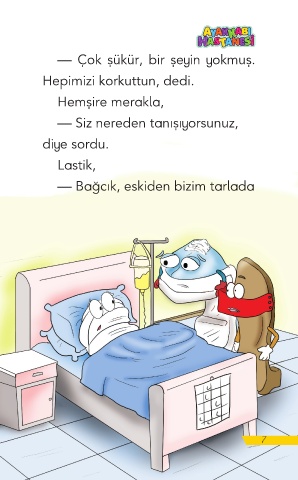 — Çok şükür, bir şeyin yokmuş. Hepimizi korkuttun, dedi. Hemşire merakla, — Siz nereden tanışıyorsunuz, diye sordu. Lastik, — Bağcık, eskiden bizim tarlada 7