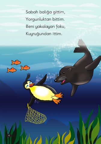 Sabah balığa gittim, Yorgunluktan bittim. Beni yakalayan foku, Kuyruğundan ittim. 4