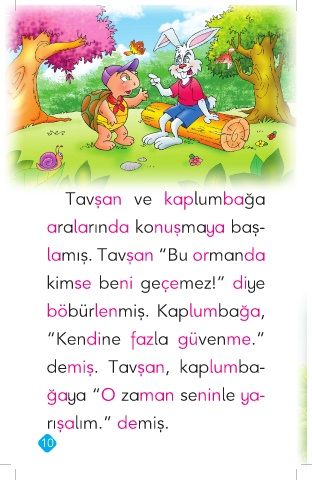 Tavşan ve kaplumbağa aralarında konuşmaya baş- lamış. Tavşan “Bu ormanda kimse beni geçemez!” diye böbürlenmiş. Kaplumbağa, “Kendine fazla güvenme.” demiş. Tavşan, kaplumba- ğaya “O zaman seninle ya- rışalım.” demiş. 10