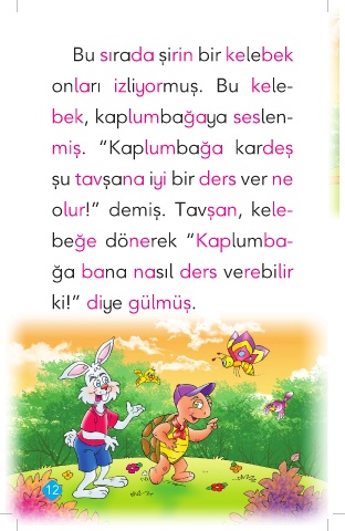 Bu sırada şirin bir kelebek onları izliyormuş. Bu kele- bek, kaplumbağaya seslen- miş. “Kaplumbağa kardeş şu tavşana iyi bir ders ver ne olur!” demiş. Tavşan, kele- beğe dönerek “Kaplumba- ğa bana nasıl ders verebilir ki!” diye gülmüş. 12