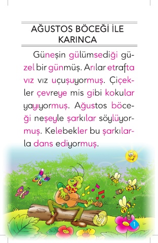 AĞUSTOS BÖCEĞİ İLE KARINCA Güneşin gülümsediği gü- zel bir günmüş. Arılar etrafta vız vız uçuşuyormuş. Çiçek- ler çevreye mis gibi kokular yayıyormuş. Ağustos böce- ği neşeyle şarkılar söylüyor- muş. Kelebekler bu şarkılar- la dans ediyormuş. 1