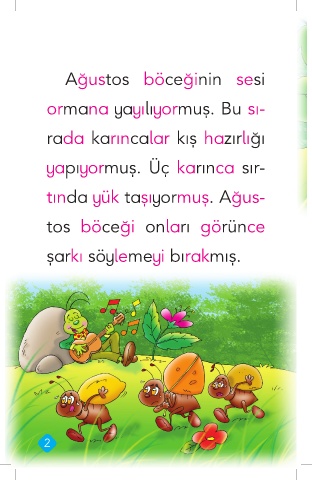 Ağustos böceğinin sesi ormana yayılıyormuş. Bu sı- rada karıncalar kış hazırlığı yapıyormuş. Üç karınca sır- tında yük taşıyormuş. Ağus- tos böceği onları görünce şarkı söylemeyi bırakmış. 2