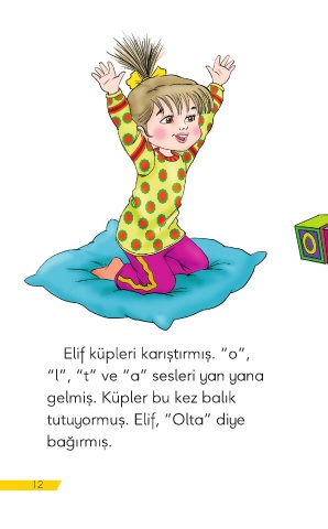 Elif küpleri karıştırmış. “o”, “l”, “t” ve “a” sesleri yan yana gelmiş. Küpler bu kez balık tutuyormuş. Elif, “Olta” diye bağırmış. 12
