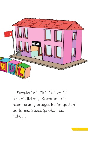 Sırayla “o”, “k”, “u” ve “l” sesleri dizilmiş. Kocaman bir resim çıkmış ortaya. Elif’in gözleri parlamış. Sözcüğü okumuş: “okul”. 13