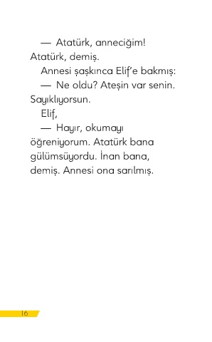 — Atatürk, anneciğim! Atatürk, demiş. Annesi şaşkınca Elif’e bakmış: — Ne oldu? Ateşin var senin. Sayıklıyorsun. Elif, — Hayır, okumayı öğreniyorum. Atatürk bana gülümsüyordu. İnan bana, demiş. Annesi ona sarılmış. 16