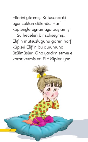 Ellerini yıkamış. Kutusundaki oyuncakları dökmüş. Harf küpleriyle oynamaya başlamış. Şu heceleri bir sökseymiş. Elif’in mutsuzluğunu gören harf küpleri Elif’in bu durumuna üzülmüşler. Ona yardım etmeye karar vermişler. Elif küpleri yan 4