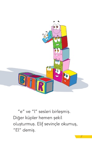 “e” ve “l” sesleri birleşmiş. Diğer küpler hemen şekil oluşturmuş. Elif sevinçle okumuş, “El” demiş. 7
