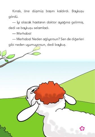 Kınalı, öne düşmüş başını kaldırdı. Baykuşu gördü. — İyi olacak hastanın doktor ayağına gelirmiş, dedi ve baykuşu selamladı. — Merhaba! — Merhaba! Neden ağlıyorsun? Sen de diğerleri gibi neden uyumuyorsun, dedi baykuş. 13