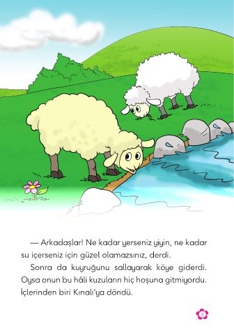 — Arkadaşlar! Ne kadar yerseniz yiyin, ne kadar su içerseniz için güzel olamazsınız, derdi. Sonra da kuyruğunu sallayarak köye giderdi. Oysa onun bu hâli kuzuların hiç hoşuna gitmiyordu. İçlerinden biri Kınalı’ya döndü. 5