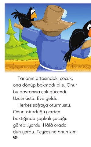 Tarlanın ortasındaki çocuk, ona dönüp bakmadı bile. Onur bu davranışa çok gücendi. Üzülmüştü. Eve geldi. Herkes sofraya oturmuştu. Onur, oturduğu yerden baktığında şapkalı çocuğu görebiliyordu. Hâlâ orada duruyordu. Teyzesine onun kim 14