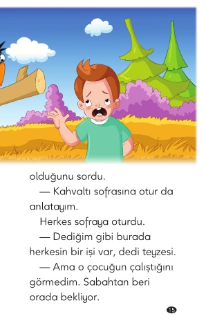 olduğunu sordu. — Kahvaltı sofrasına otur da anlatayım. Herkes sofraya oturdu. — Dediğim gibi burada herkesin bir işi var, dedi teyzesi. — Ama o çocuğun çalıştığını görmedim. Sabahtan beri orada bekliyor. 15