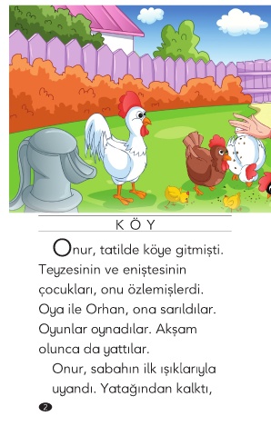 KÖY O nur, tatilde köye gitmişti. Teyzesinin ve eniştesinin çocukları, onu özlemişlerdi. Oya ile Orhan, ona sarıldılar. Oyunlar oynadılar. Akşam olunca da yattılar. Onur, sabahın ilk ışıklarıyla uyandı. Yatağından kalktı, 2