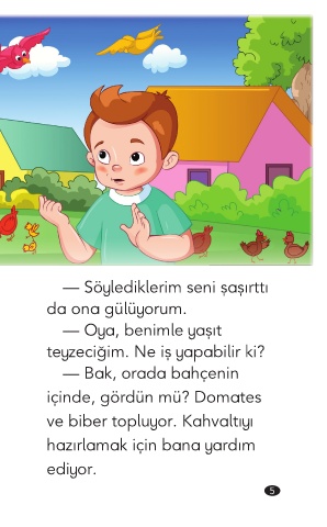 — Söylediklerim seni şaşırttı da ona gülüyorum. — Oya, benimle yaşıt teyzeciğim. Ne iş yapabilir ki? — Bak, orada bahçenin içinde, gördün mü? Domates ve biber topluyor. Kahvaltıyı hazırlamak için bana yardım ediyor. 5
