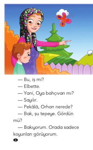 — Bu, iş mi? — Elbette. — Yani, Oya bahçıvan mı? — Sayılır. — Pekâlâ, Orhan nerede? — Bak, şu tepeye. Gördün mü? — Bakıyorum. Orada sadece koyunları görüyorum. 6