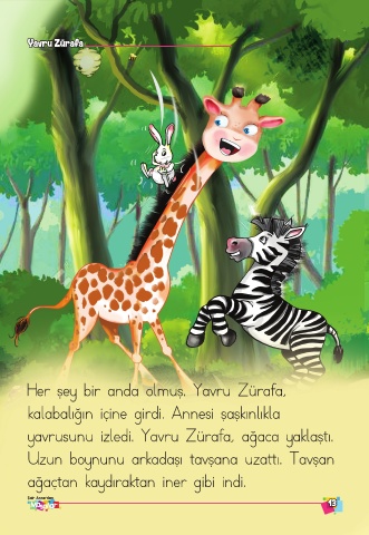 Yavru Zürafa Her şey bir anda olmuş. Yavru Zürafa, kalabalığın içine girdi. Annesi şaşkınlıkla yavrusunu izledi. Yavru Zürafa, ağaca yaklaştı. Uzun boynunu arkadaşı tavşana uzattı. Tavşan ağaçtan kaydıraktan iner gibi indi. Şair Anne’den 13