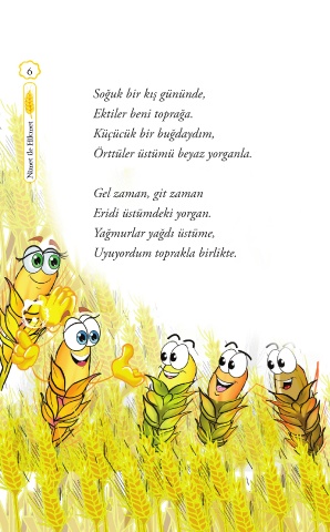 6 Soğuk bir kış gününde, Ektiler beni toprağa. Nimet ile Hikmet Küçücük bir buğdaydım, Örttüler üstümü beyaz yorganla. Gel zaman, git zaman Eridi üstümdeki yorgan. Yağmurlar yağdı üstüme, Uyuyordum toprakla birlikte.