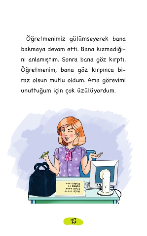 Öğretmenimiz gülümseyerek bana bakmaya devam etti. Bana kızmadığı- nı anlamıştım. Sonra bana göz kırptı. Öğretmenim, bana göz kırpınca bi- raz olsun mutlu oldum. Ama görevimi unuttuğum için çok üzülüyordum. 15 Erdem +++ Fatma ++ Ecem ++++ Arda +++++