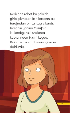 Kedilerin rahat bir şekilde girip çıkmaları için kasanın alt tarafından bir tahtayı çıkardı. Kasanın yanına Yusuf’un kullandığı eski saklama kaplarından ikisini koydu. Birinin içine süt, birinin içine su doldurdu. 9