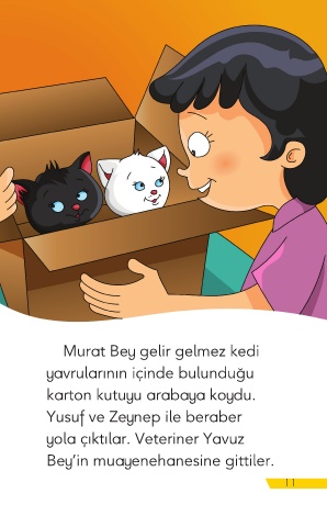Murat Bey gelir gelmez kedi yavrularının içinde bulunduğu karton kutuyu arabaya koydu. Yusuf ve Zeynep ile beraber yola çıktılar. Veteriner Yavuz Bey’in muayenehanesine gittiler. 11