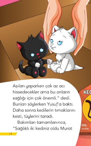 Aşıları yaparken çok az acı hissedecekler ama bu onların sağlığı için çok önemli.” dedi. Bunları söylerken Yusuf’a baktı. Daha sonra kedilerin tırnaklarını kesti, tüylerini taradı. Bakımları tamamlanınca, “Sağlıklı iki kediniz oldu Murat 14