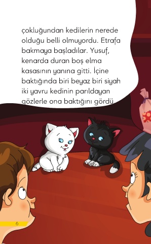 çokluğundan kedilerin nerede olduğu belli olmuyordu. Etrafa bakmaya başladılar. Yusuf, kenarda duran boş elma kasasının yanına gitti. İçine baktığında biri beyaz biri siyah iki yavru kedinin parıldayan gözlerle ona baktığını gördü. 6