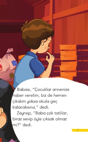 Babası, “Çocuklar annenize haber verelim, biz de hemen çıkalım yoksa okula geç kalacaksınız.” dedi. Zeynep, “Baba çok tatlılar, biraz sevip öyle çıksak olmaz mı?” dedi. 7