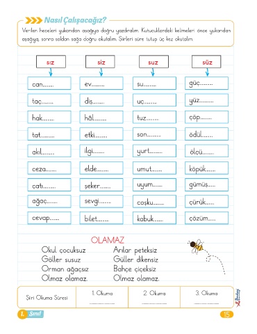 aşağıya, sonra soldan sağa doğru okutalım. Şiirleri süre tutup üç kez okutalım.