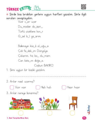 Şiirde boş bırakılan yerlere uygun harfleri yazalım. Şiirle ilgili