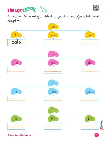TÜRKÇE 1. Gün 1BDERS-001 Heceleri örnekteki gibi birleştirip yazalım. Yazdığımız kelimeleri okuyalım. ba le cak lina bale se ne pet def el li mas veda as kı lan ker 1. Sınıf Yarıyılda Biraz Ders 1