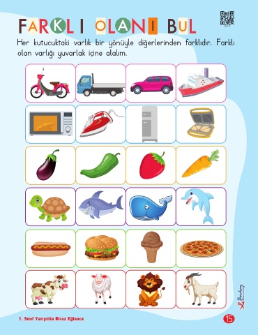 LN F R L I O A I B L 1BE-015 K A U Her kutucuktaki varlık bir yönüyle diğerlerinden farklıdır. Farklı olan varlığı yuvarlak içine alalım. 1. Sınıf Yarıyılda Biraz Eğlence 15