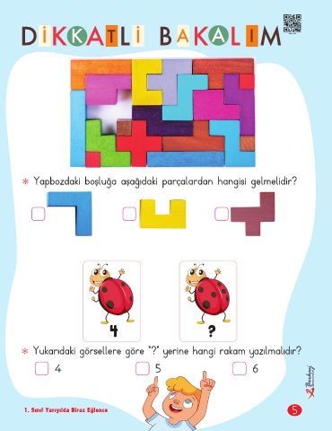 D K A T L İ B K L I M 1BE-005 A K A İ Yapbozdaki boşluğa aşağıdaki parçalardan hangisi gelmelidir? 4 ? Yukarıdaki görsellere göre “?” yerine hangi rakam yazılmalıdır? 4 5 6 1. Sınıf Yarıyılda Biraz Eğlence 5