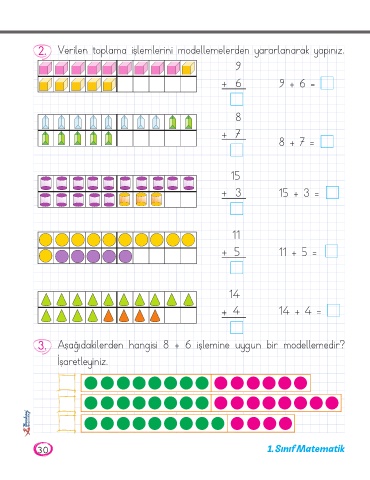 2. Verilen toplama işlemlerini modellemelerden yararlanarak yapınız. 9 + 6 9 + 6 = 8 + 7 8 + 7 = 15 + 3 15 + 3 = 11 + 5 11 + 5 = 14 + 4 14 + 4 = 3. Aşağıdakilerden hangisi 8 + 6 işlemine uygun bir modellemedir? İşaretleyiniz. 30 1. Sınıf Matematik