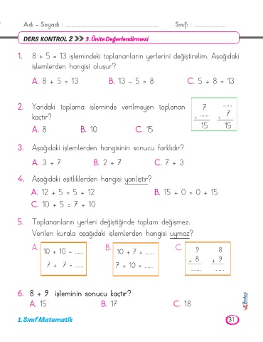 1. 8 + 5 = 13 işlemindeki toplananların yerlerini değiştirelim. Aşağıdaki