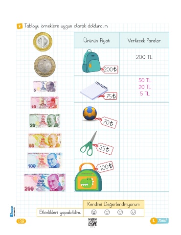 2 Tabloyu örneklere uygun olarak dolduralım. Ürünün Fiyatı Verilecek Paralar 200 TL 200¨ 50 TL 20 TL 75¨ 5 TL 70¨ 35¨ 100¨ Kendimi Değerlendiriyorum Etkinlikleri yapabildim. 138 1. Sınıf 1BMAT-132