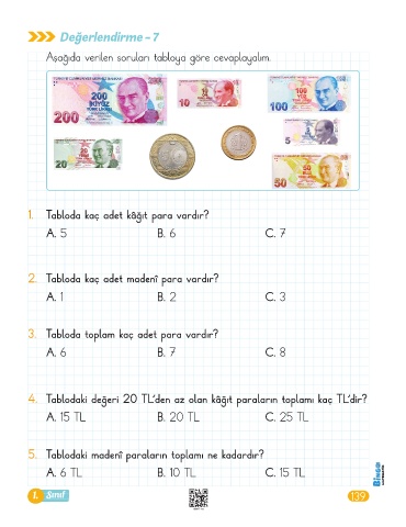 4. Tablodaki değeri 20 TL’den az olan kâğıt paraların toplamı kaç TL’dir?