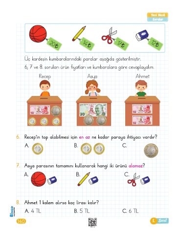 8. Ahmet 1 kalem alırsa kaç lirası kalır?