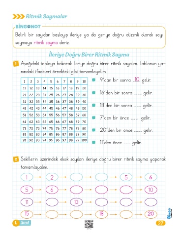 1 Aşağıdaki tabloya bakarak ileriye doğru birer ritmik sayalım. Tablonun ya-