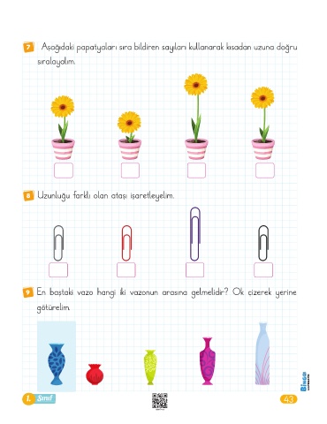 7 Aşağıdaki papatyaları sıra bildiren sayıları kullanarak kısadan uzuna doğru sıralayalım. 8 Uzunluğu farklı olan ataşı işaretleyelim. 9 En baştaki vazo hangi iki vazonun arasına gelmelidir? Ok çizerek yerine götürelim. 1. Sınıf 43 1BMAT-039
