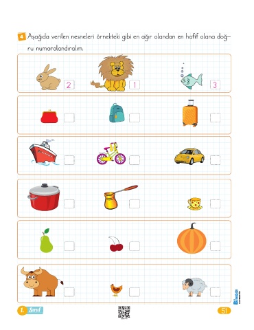 4 Aşağıda verilen nesneleri örnekteki gibi en ağır olandan en hafif olana doğ- ru numaralandıralım. 2 1 3 1. Sınıf 51 1BMAT-047