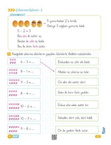1 Aşağıdaki çıkarma işlemlerini yapalım. İşlemlerle ifadeleri eşleştirelim.