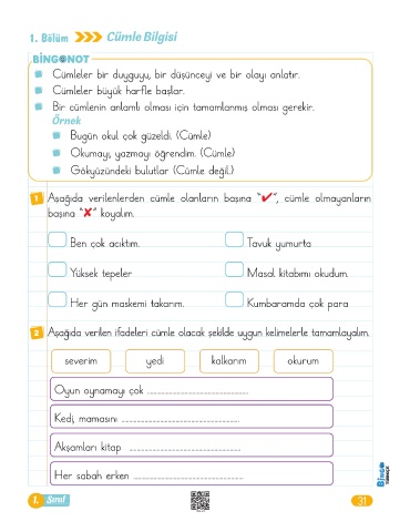 1 Aşağıda verilenlerden cümle olanların başına “✔”, cümle olmayanların