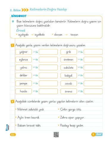 1 Aşağıda yanlış yazımı verilen kelimelerin doğrusunu yazalım.