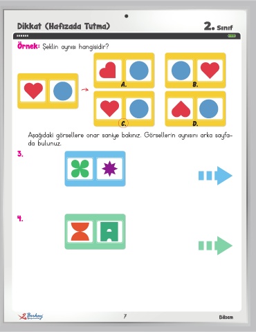 Dikkat (Hafızada Tutma) 2. Sınıf Örnek: Şeklin aynısı hangisidir? A. B. C. D. Aşağıdaki görsellere onar saniye bakınız. Görsellerin aynısını arka sayfa- da bulunuz. 3. 4. 7 Bilsem