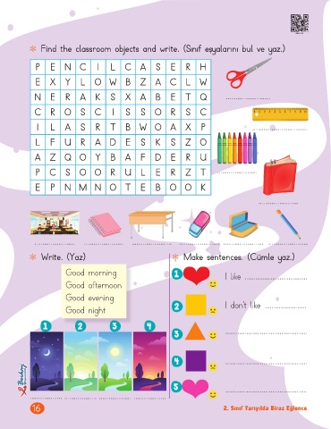 Find the classroom objects and write. (Sınıf eşyalarını bul ve yaz.)