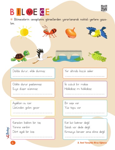 Bilmecelerin cevaplarını görsellerden yararlanarak noktalı yerlere yaza-