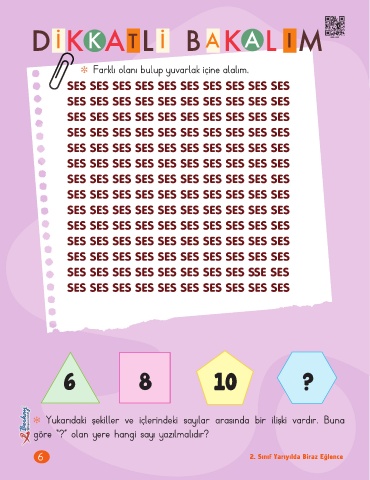 D K A T L İ B K L I M 2BE-006 A K A İ Farklı olanı bulup yuvarlak içine alalım. 6 8 10 ? Yukarıdaki şekiller ve içlerindeki sayılar arasında bir ilişki vardır. Buna göre "?” olan yere hangi sayı yazılmalıdır? 6 2. Sınıf Yarıyılda Biraz Eğlence