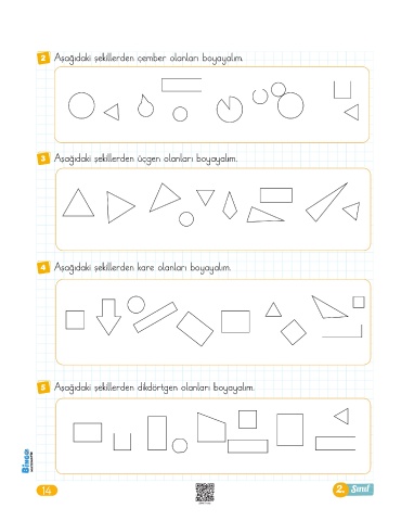 2 Aşağıdaki şekillerden çember olanları boyayalım. 3 Aşağıdaki şekillerden üçgen olanları boyayalım. 4 Aşağıdaki şekillerden kare olanları boyayalım. 5 Aşağıdaki şekillerden dikdörtgen olanları boyayalım. 14 2. Sınıf 2BMAT1-025