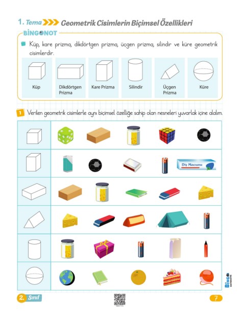 1 Verilen geometrik cisimlerle aynı biçimsel özelliğe sahip olan nesneleri yuvarlak içine alalım.