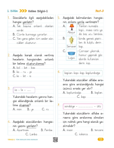 1. Bölüm Kelime Bilgisi-1 Test-3